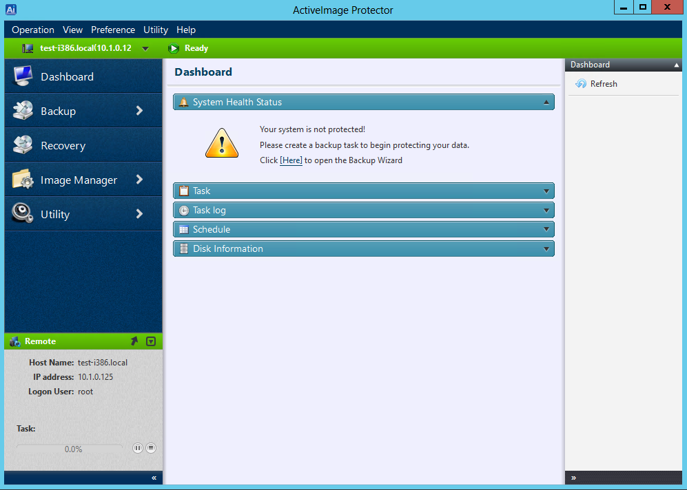ActiveImage console (GUI) is used to operate ActiveImage agent. The use of ActiveImage console allows users to connect to and operate ActiveImage agent on remote host over network.