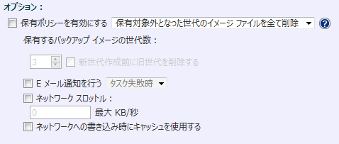 · ネットワーク スロットル - ネットワーク共有フォルダーにイメージ ファイルを保存する時に、利用するネットワーク帯域をキロバイト単位で制限します。