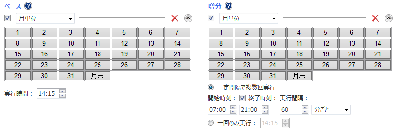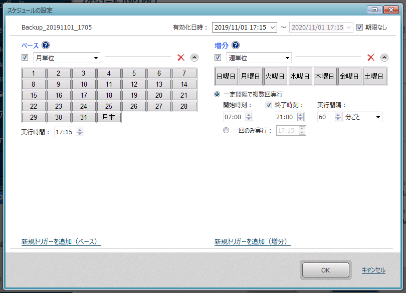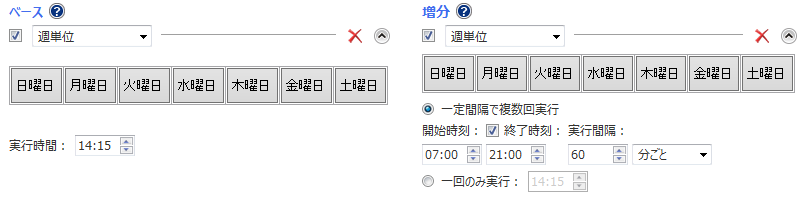 ベース、または増分スケジュールのトリガー タイプをコンボボックスから指定してください。指定可能なタイプは週単位、月単位、指定日時です。チェックボックスのチェックを外すことで、設定したトリガーを削除せずに無効にすることができます。スケジュールを作成するためには少なくとも有効なスケジュールが1つ以上必要です。