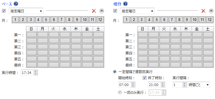 · 一定間隔で複数回実行 - 指定した日の実行時間帯と実行間隔を指定できます。