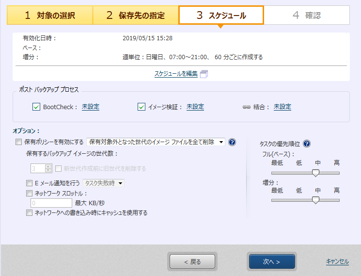 ベース、または増分バックアップの実行優先順位を指定できます。