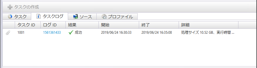 現在まで実行されたタスクのログが表示されます。ログ ID をクリックすることで詳細ログを確認できます。