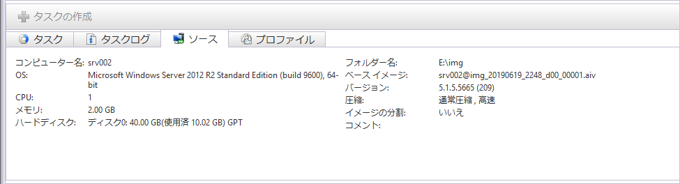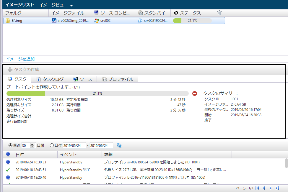 ダッシュボードには、イメージ リストで選択しているイメージに関する情報が表示されます。現在実行中のタスク、タスク ログ リスト、作成済みプロファイルのサマリーが確認でき、必要であればプロファイルの編集、無効化/有効化、即時実行、削除が行えます。