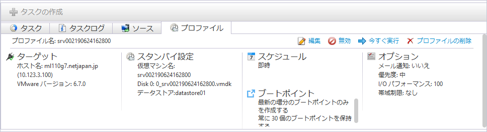 · 今すぐ実行 - 作成済みプロファイルを今すぐ実行できます。スケジュールで[即時]を選択している場合は実行できません。