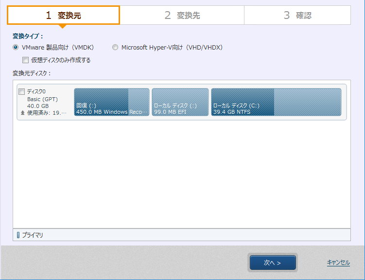変換タイプを選択します。仮想マシンではなく、仮想ディスクのみ作成する場合は[仮想ディスクのみ作成する]を有効にしてください。