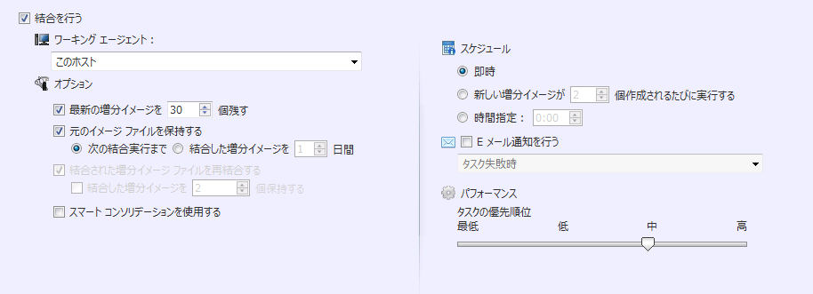 結合された増分イメージファイルを再結合する - 結合されたファイルを再結合します。結合済みファイルを保持する場合は「結合した増分イメージを xx 個保持する」を有効にして数を指定します。保持対象から外れる最も古いイメージは、次に古いイメージと再結合されます。