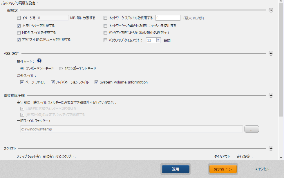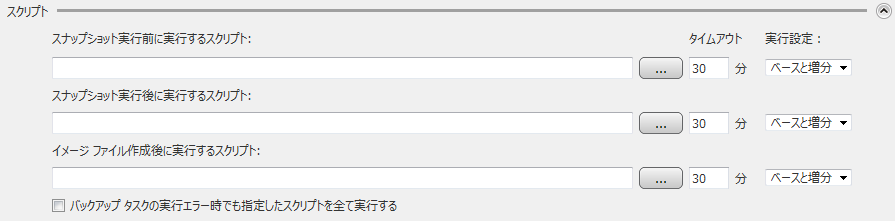 指定したスクリプトをスナップショット実行前、実行後、およびイメージ ファイル作成後に実行することができます。