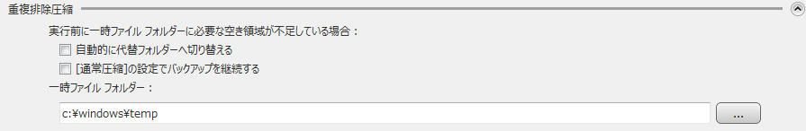 重複排除圧縮を有効にしたタスク開始前に一時ファイル フォルダーに十分な空き容量が無い場合の挙動や、一時ファイル フォルダーのパスを指定できます。