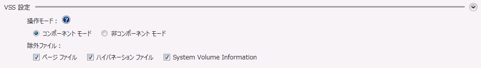 [操作モード] - VSS コンポーネント モードで使用される VSS ライターに影響します。VSS コンポーネント モードが有効な場合、バックアップの前に追加のデータ整合性チェックが実行されます(サポートされている場合)。