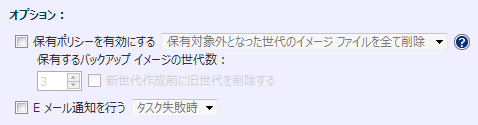 · 保有ポリシーを有効にする - 保有するバックアップ イメージ ファイルの世代数を制限できます。世代とは、ベース イメージ ファイルとそれに関連する増分、または差分イメージ ファイルのことです。保有制限に達すると、新しい世代が作成される際に最も古い世代が削除されます。