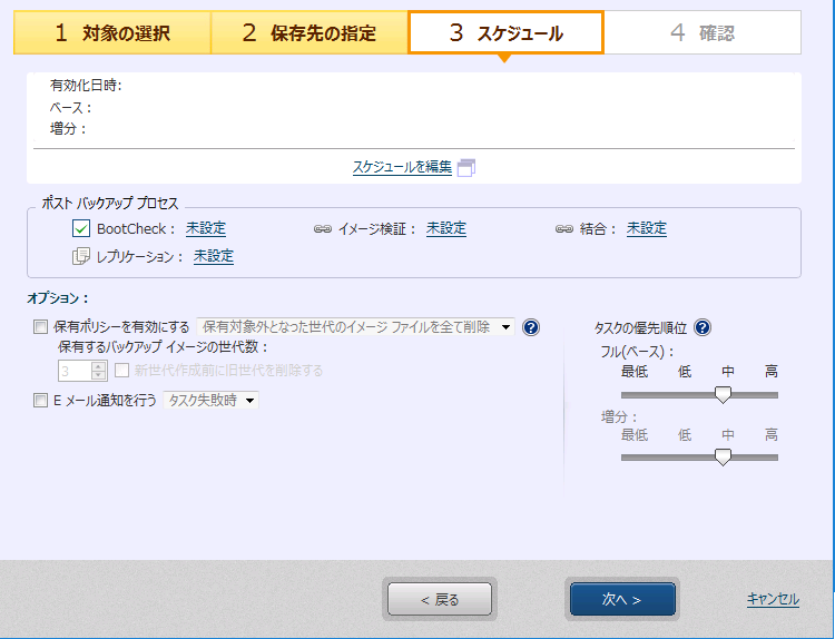 ベース、または増分バックアップの実行優先順位を指定できます。